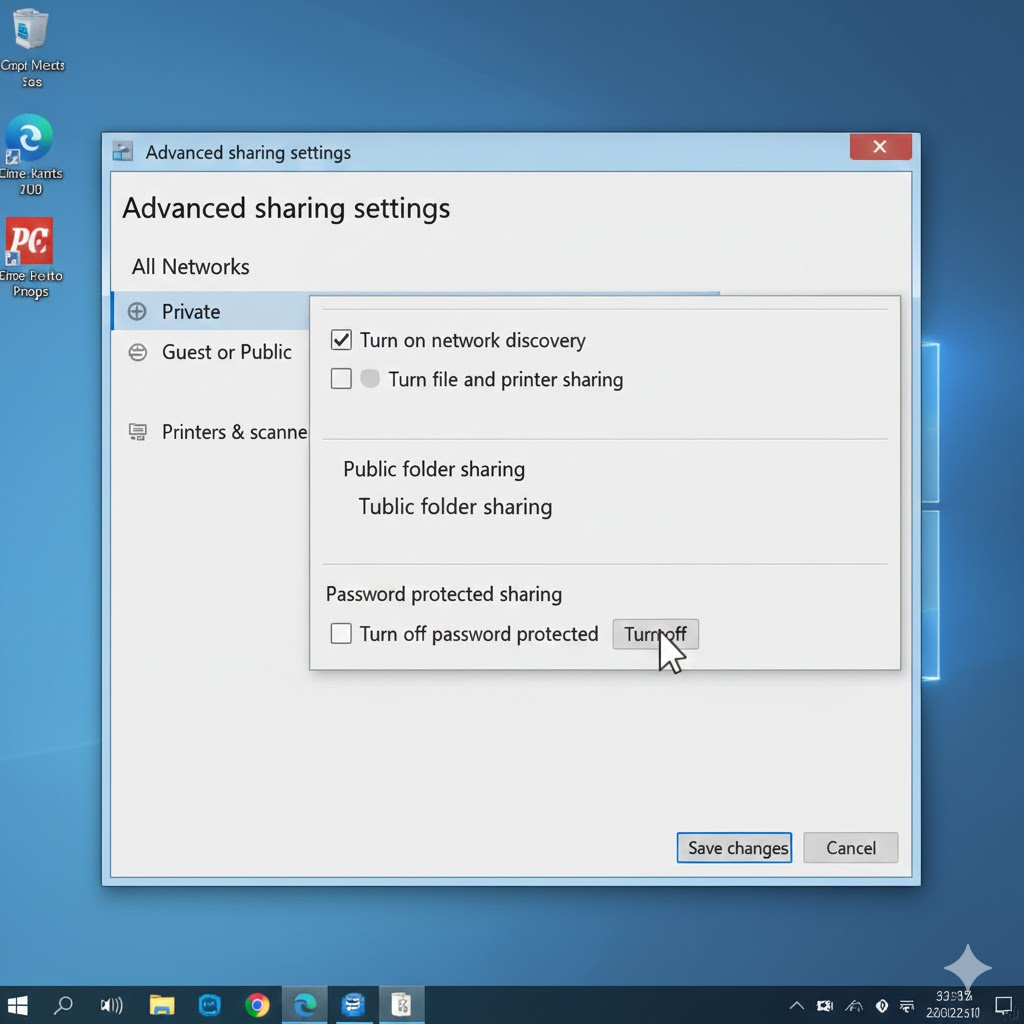 - Chọn “Turn off password protected sharing” (Tắt chia sẻ được bảo vệ bằng mật khẩu) nếu bạn muốn các máy khác kết nối mà không cần mật khẩu. Nếu bạn muốn bảo mật, hãy giữ nguyên và các máy khác sẽ cần tên người dùng/mật khẩu của máy chủ.