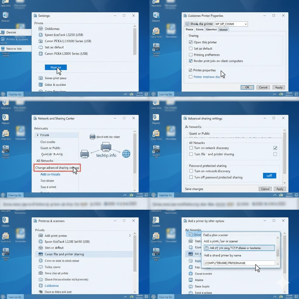 Phương pháp này áp dụng khi bạn có một máy in kết nối trực tiếp với một máy tính (qua USB) và muốn chia sẻ máy in đó cho các máy tính khác trong mạng.