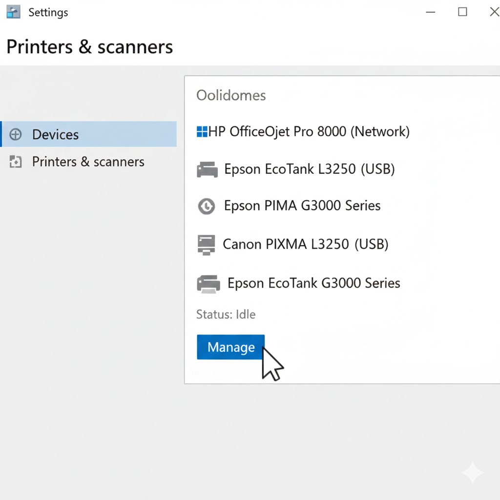 - Tìm máy in của bạn, nhấp vào tên máy in và chọn Manage (Quản lý).